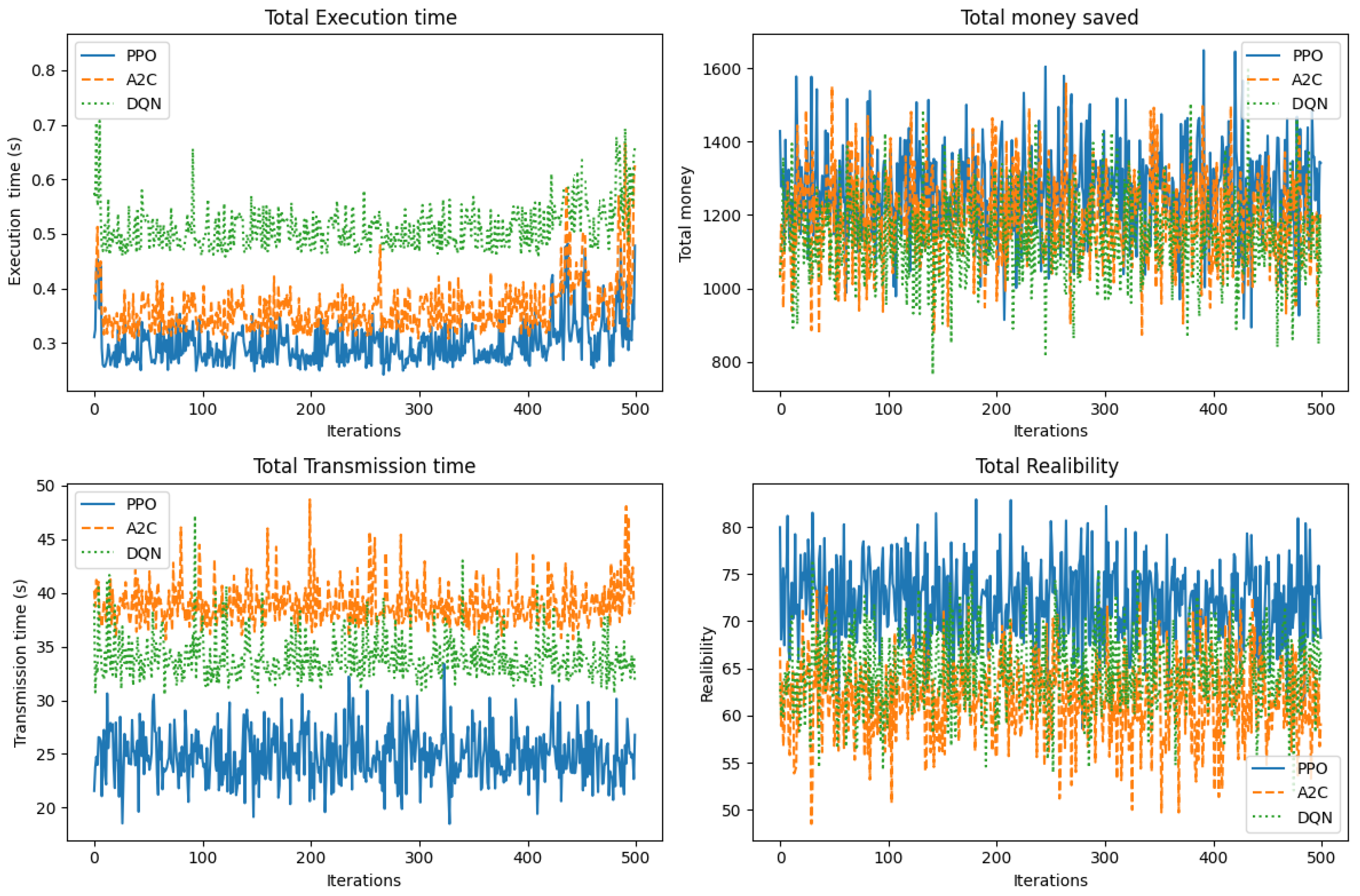 Figure 6 presents the experimental results comparing the performance of the three algorithms: our approach based on PPO, A2C, and DQN. Each algorithm was evaluated over 500 iterations, with each iteration using a new set of requests and a corresponding set of available resources.