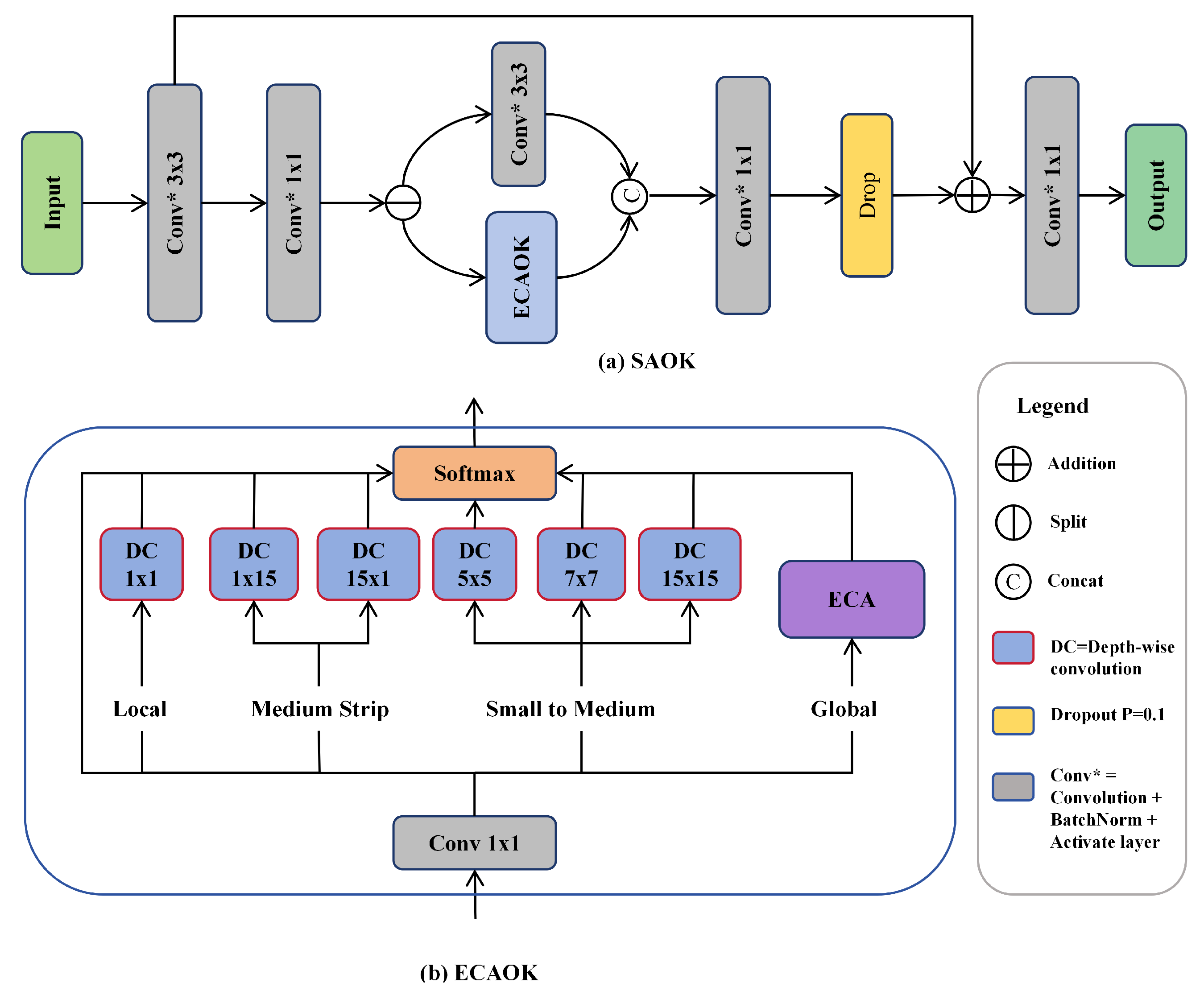 ECA-enhanced Omni-Kernel (ECAOK): To effectively aggregate the multi-scale features extracted by diverse kernel configurations, we design the ECA-enhanced Omni-Kernel (ECAOK) module as the core computational unit of SAOK. The ECAOK module integrates channel attention mechanism with adaptive multi-scale feature fusion to enhance feature discriminability for small objects. Given an input feature