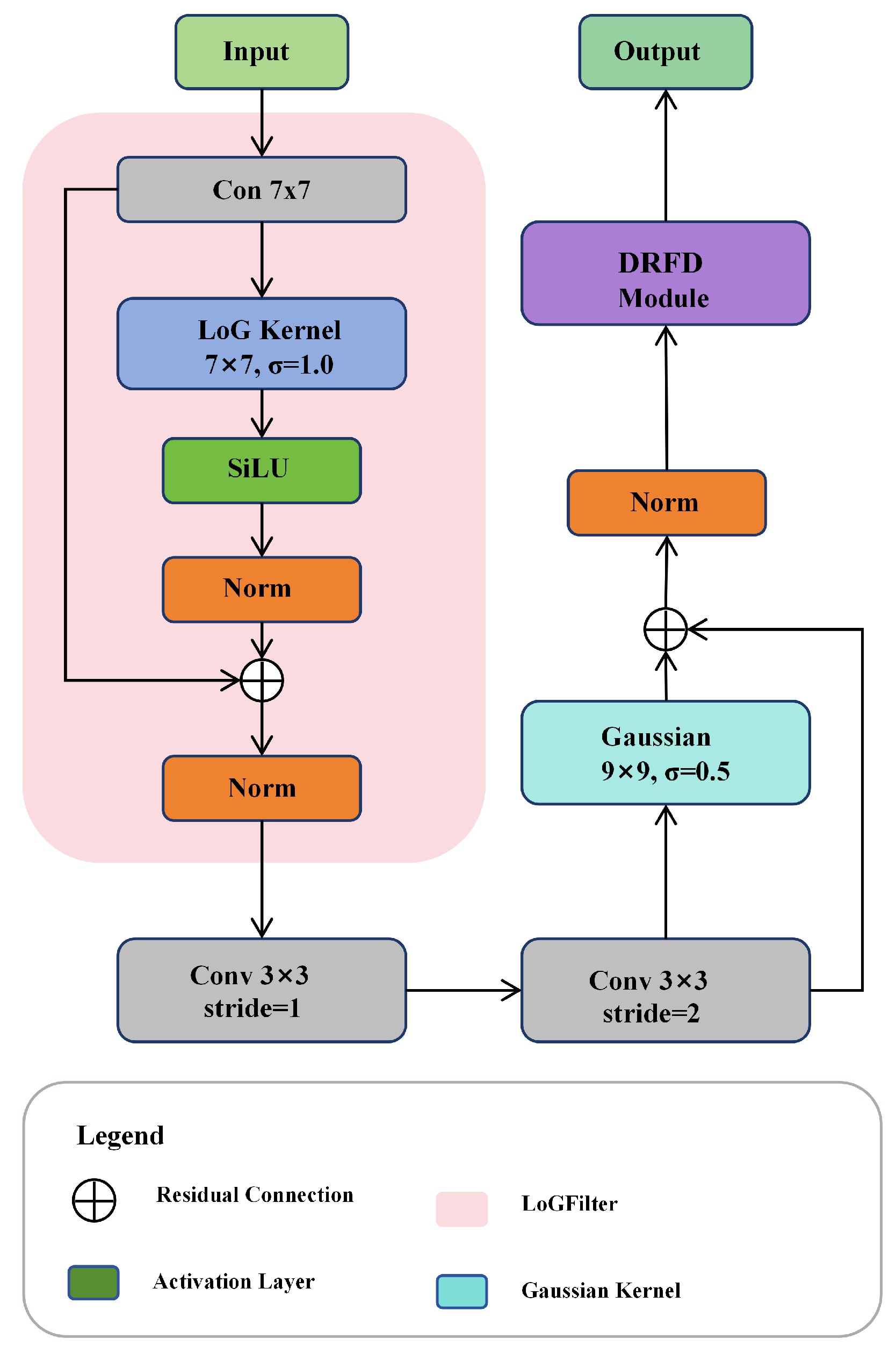 Figure 1, addresses key challenges in UAV-based small object detection through specialized modules. The LoGStem component enhances the initial feature extraction stage by outputting quarter-resolution representations while simultaneously filtering noise through Laplacian-of-Gaussian operations. To enable seamless multi-scale fusion, backbone P4 features are spatially downsampled via PixelUnshuffle, ensuring dimensional alignment with P3-level SPPF outputs after upsampling.