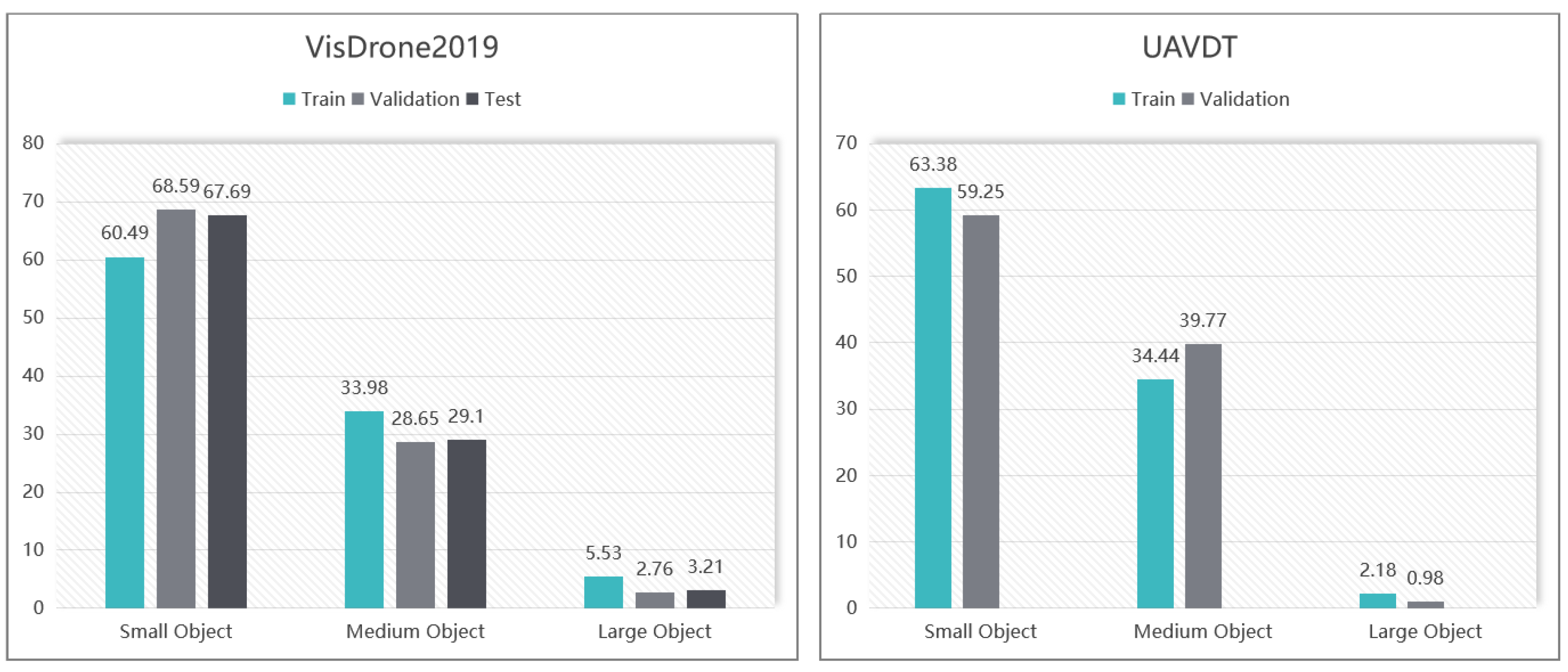 2 pixels). The statistics reveal that both datasets are heavily dominated by small objects, which constitute over 60% of the samples in both datasets. Large objects are extremely rare in both datasets, particularly in UAVDT, where they account for less than 3%.