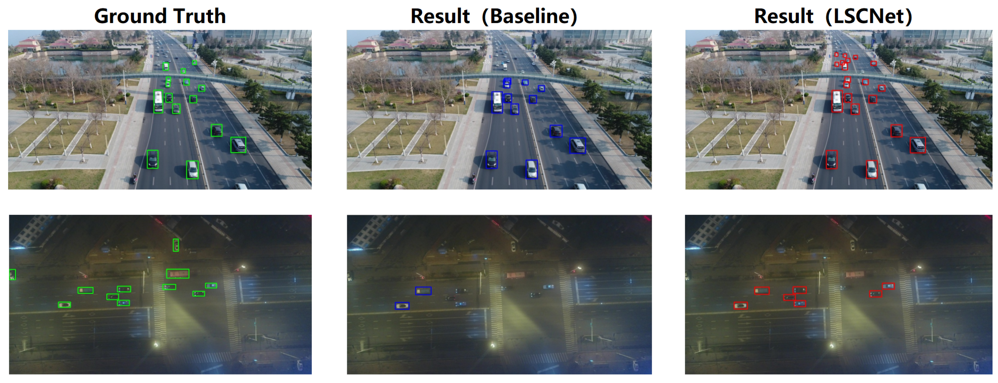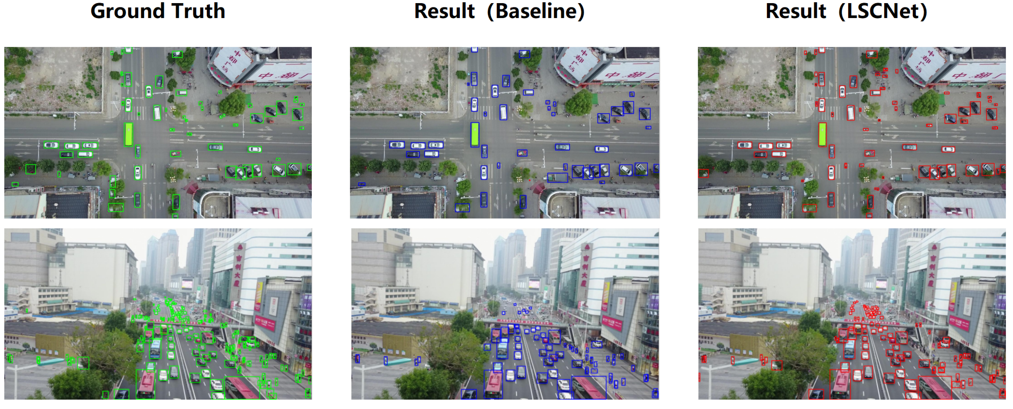 Figure 5, we present a three-way comparison featuring Ground Truth (GT) annotations, baseline model outputs, and LSCNet predictions. In the upper example showing an intersection scene, the GT labels 68 objects and the baseline captures 49, while LSCNet identifies 76 objects. The lower example presents a congested urban traffic environment where the GT marks 186 objects, the baseline detects only 72, and LSCNet achieves 113 detections.