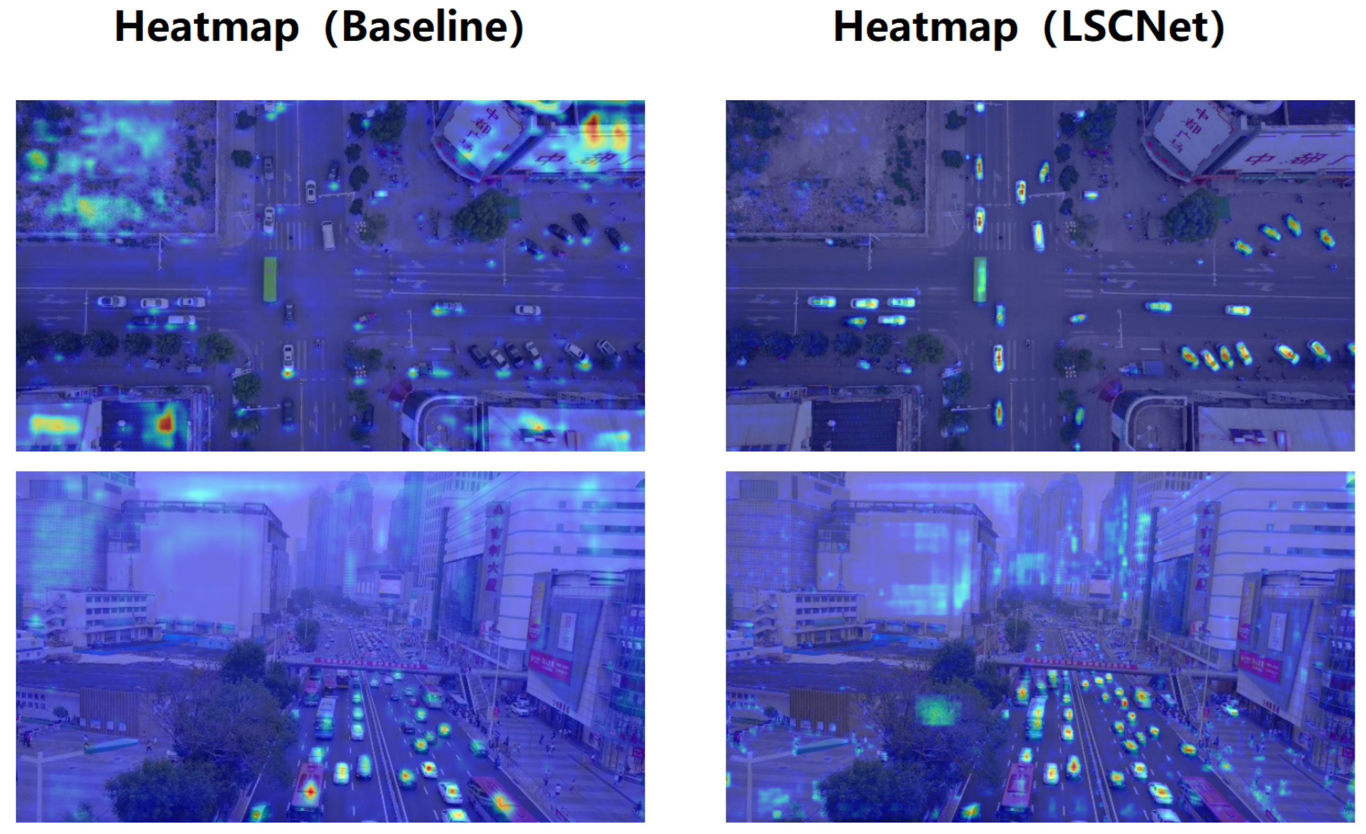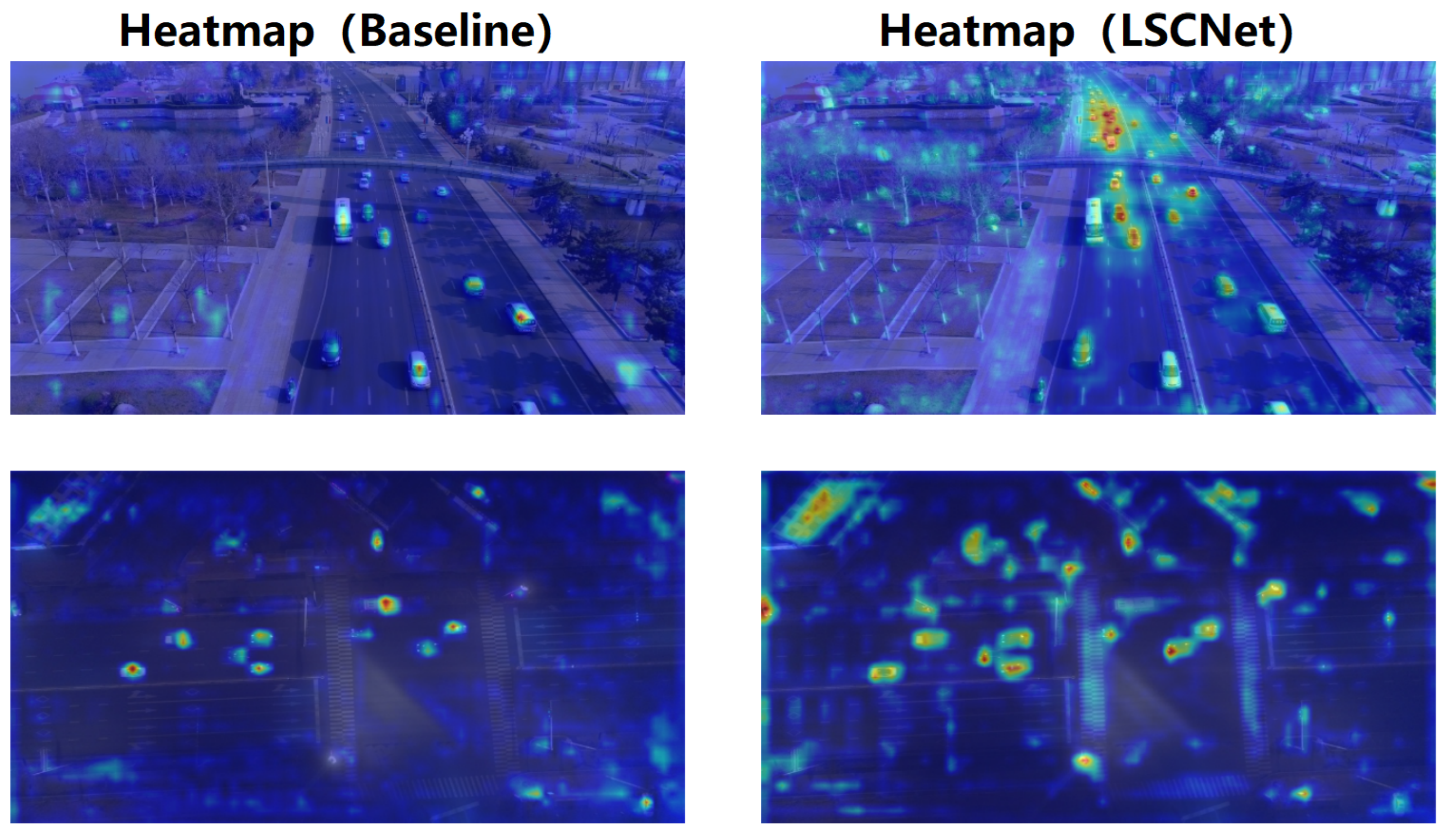 Figure 6 provides additional insights: the baseline model (left panel) shows a scattered attention distribution with considerable background interference, especially in areas with poor contrast, whereas LSCNet (right panel) exhibits focused attention responses targeting small objects, including roadside pedestrians and faraway vehicles, while effectively minimizing irrelevant background activation.