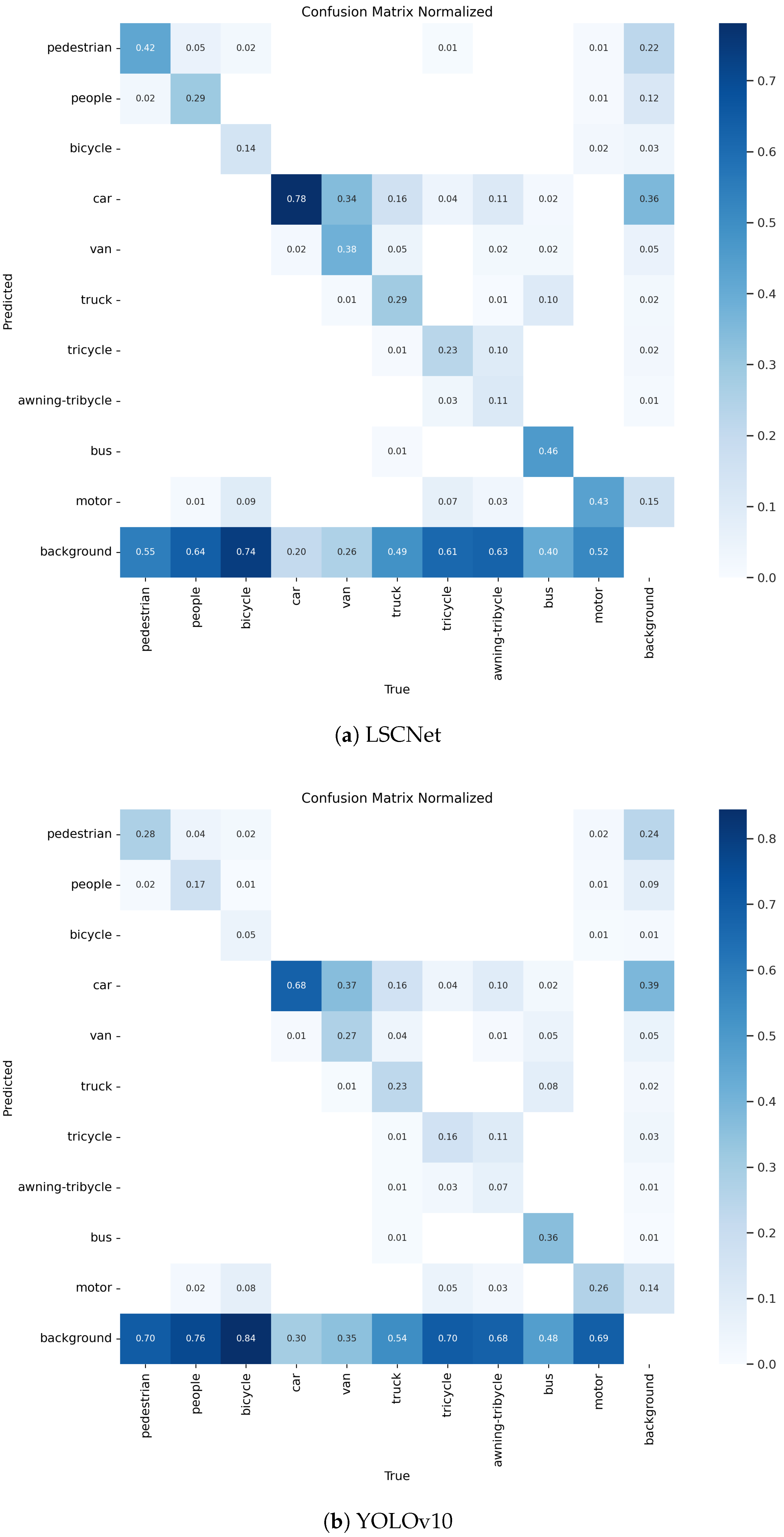 For instance, the high value of 0.70 in the cell (Background, Pedestrian) indicates a relatively high value of missed detections for small pedestrians. Additionally, notable inter-class confusion exists between visually similar categories. For example, 37% of “vans” were incorrectly classified as “cars”, and semantic confusion exists between “pedestrian” and “people.” This may be attributed to the low resolution of aerial images, which makes it difficult to discern subtle structural differences between vehicle types, as well as semantic ambiguity in the dataset annotation standards. These are common challenges in high-altitude aerial imagery.