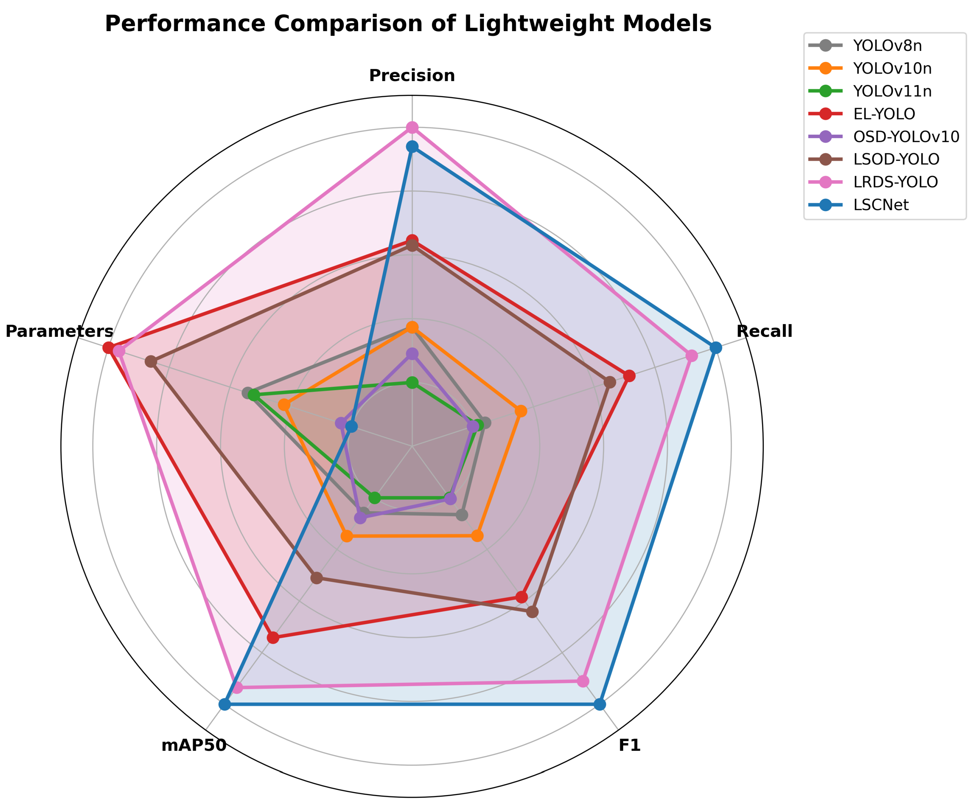 Comparison with lightweight models: LSCNet demonstrates superior efficiency by achieving 44.6% with only 1.48 M parameters and 27.3 GFLOPs. Among models with comparable parameter counts, LSCNet exhibits a significant performance advantage: it surpasses OSD-YOLOv10 (1.6M parameters), the model with the most similar size, by 11.2 percentage points in while using fewer parameters. Furthermore, LSCNet matches the detection performance of LRDS-YOLO with 64.5% fewer parameters, reducing the model size from 4.17 M to 1.48 M parameters.
