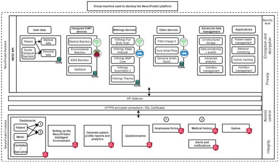 The data that are provided by commercial devices such as Withings are first collected and encrypted on the manufacturer’s servers. NeuroPredict platform uses secure OAuth 2.0 authorization to retrieve this data (from Withings, through the Withings Health Data API) [39]. Only those de-identified physiological, sleep, and activity metrics that the user allowed access to are retrieved. They are obtained in JSON format, checked against the NeuroPredict platform’s semantic descriptors, and stored in the MySQL/MongoDB databases hosted on ICIPRO. They are processed exclusively in the platform’s environment hosted on ICIPRO. This approach is similar to the ones adopted for other systems developed by our team, involving collecting data originating from a Withings device from the Withings cloud through authenticated API calls and adding it to local processing pipelines [8,40]. Withings ensures GDPA compliance for all health data stored on its cloud infrastructure and maintains HIPAA-aligned safeguards for U.S. users, according to its regulatory and privacy policies.