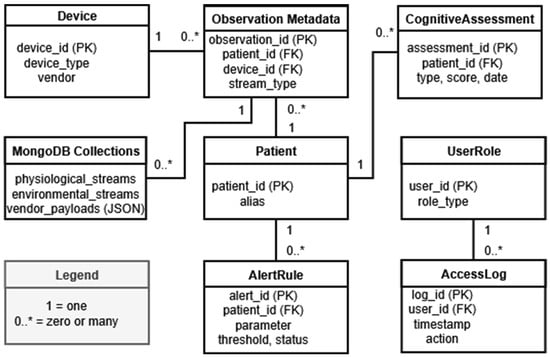 The NeuroPredict platform collects data from various sources: (1) IoMT sensors and smart devices tracking daily activities and behavior on an ongoing and unobtrusive basis; (2) clinical and medical history data, such as chronic conditions, treatments, surgeries, allergies, and family history, facilitating personalized monitoring and treatment; (3) patients and caregivers manually inputting data for devices that cannot send data automatically, such as glucometers (e.g., CareSens (i-SENS, Inc., Seoul, Republic of Korea)). Caregivers are seen by the NeuroPredict platform as having a role that is linked to—but distinct from—that of patients. This separation between roles contributes to the platform’s security and privacy by facilitating appropriate access control, clear acknowledgement of manual entries, and full traceability. Data are ingested both in structured formats (e.g., SQL-based clinical records) and semi-structured ones (JSON outputs from wearable devices), and they are harmonized in the database layer.