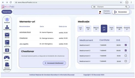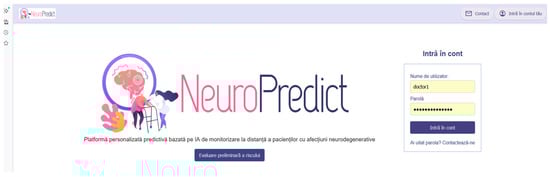 These frontend technologies were integrated with the intention to support usability and accessibility for patients and healthcare providers, following established design principles. The current version of the platform is a proof of concept; thus, a formal usability evaluation has not been performed yet. The NeuroPredict platform contains custom dashboards containing useful information and operations for each user category. The UI/UX design includes features such as customization options for contrast and text size to improve accessibility for users with diverse requirements.