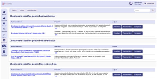 The NeuroPredict platform includes two types of cognitive assessments: standardized cognitive tests (e.g., Mini-Mental State Exam (MMSE), MoCA), which objectively rate cognitive functions, and interactive cognitive games, which help evaluate memory, attention, and executive functions. The results of these assessments are saved in the patient’s profile and help monitor cognitive functions while also stimulating mental engagement.