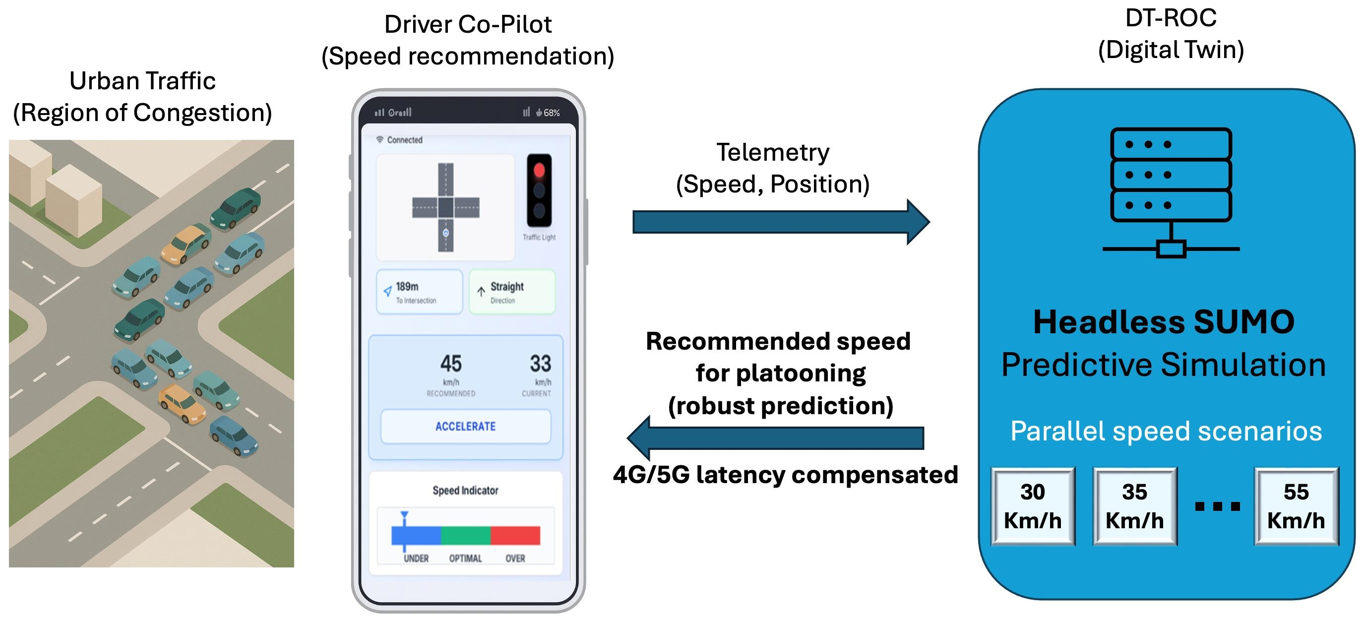 The proposed Co-Pilot operates over a distributed Digital Twin architecture. Each Region of Congestion (ROC) is represented by a dedicated Digital Twin instance (DT-ROC), which maintains continuous alignment with the corresponding real-world traffic segment. This localized representation provides the initial conditions for executing short-horizon predictive simulations based on the most recent traffic data. Through this continuous synchronization, the Co-Pilot ensures that simulations remain anchored to actual traffic evolution, enabling timely and context-aware speed recommendations. The architecture integrates real-time data acquisition, short-horizon anticipatory simulation, and collaborative decision-making across local and global instances.