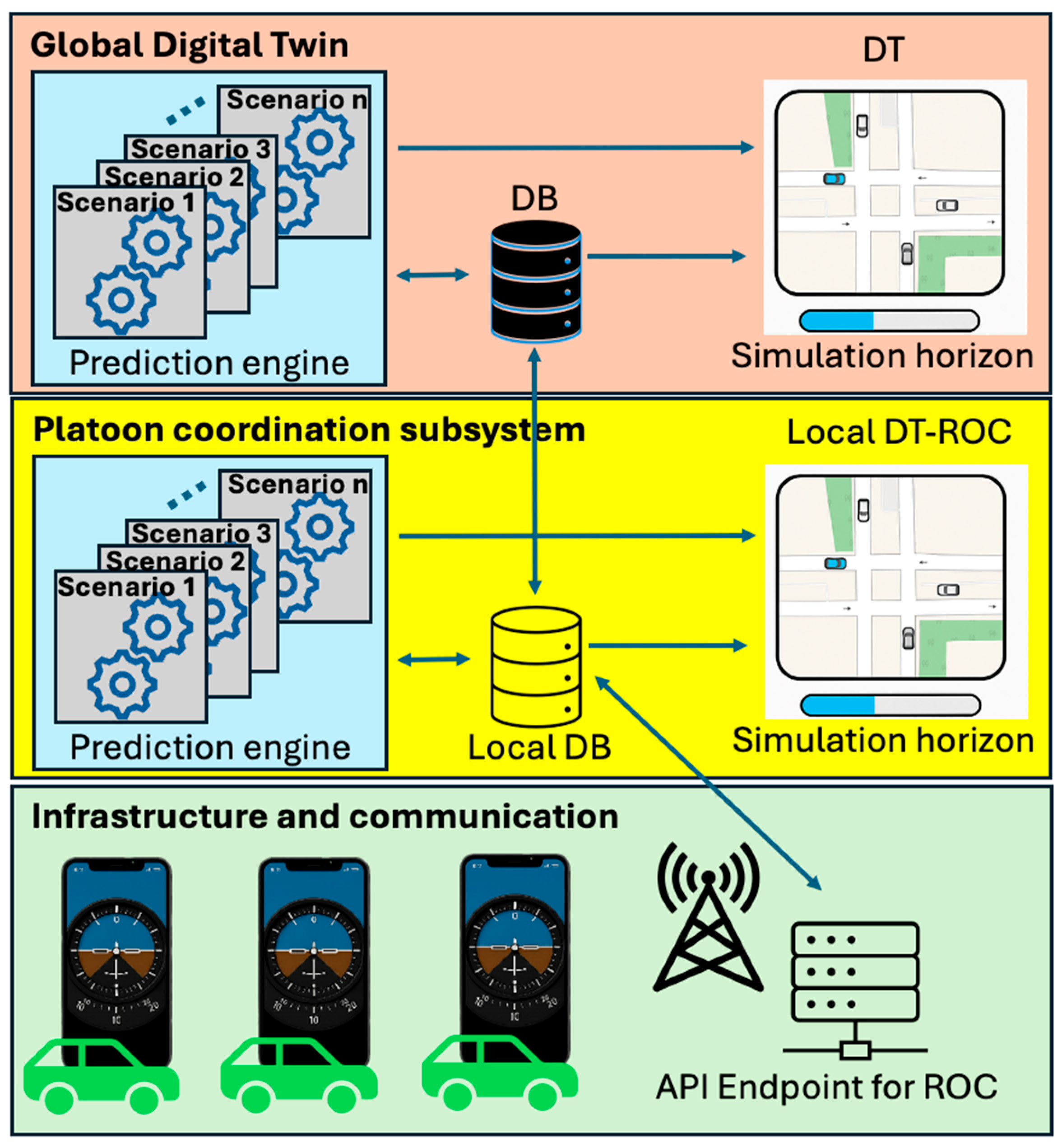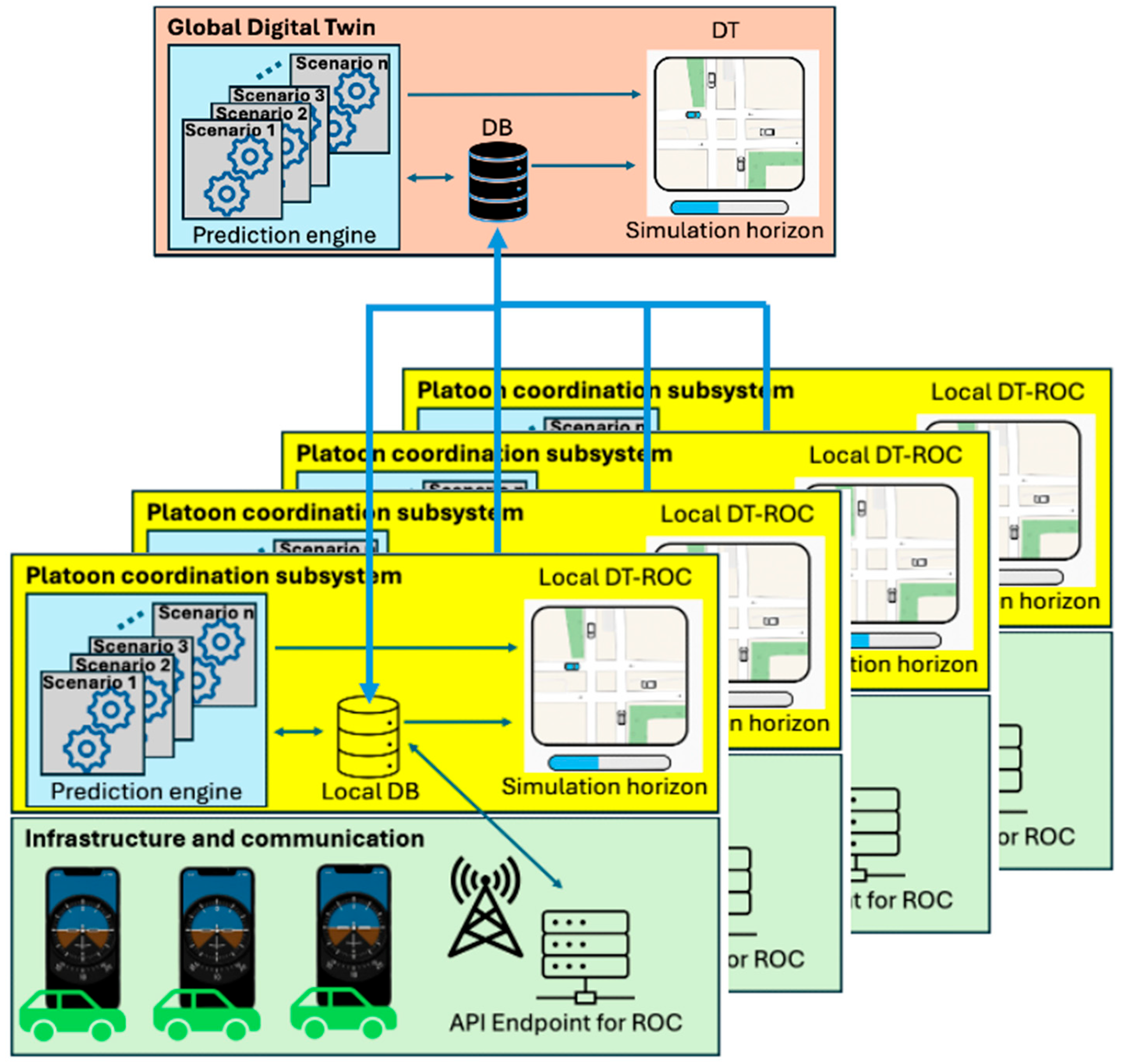 A federated Global DT aggregates state information from all DT-ROC instances. It maintains cross-regional consistency (e.g., between adjacent intersections or corridors) without overriding local autonomy. This layer ensures that distributed predictions remain consistent when multiple ROCs interact, preventing conflicting recommendations across adjacent regions.