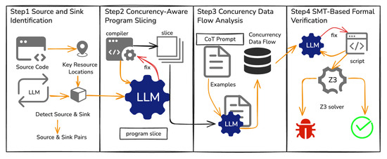 - Wang, C.; Zhang, W.; Su, Z.; Xu, X.; Xie, X.; Zhang, X. LLMDFA: Analyzing dataflow in code with large language models. In Proceedings of the 38th International Conference on Neural Information Processing Systems (NIPS ’24), Red Hook, NY, USA, 10–15 December 2024. [Google Scholar]