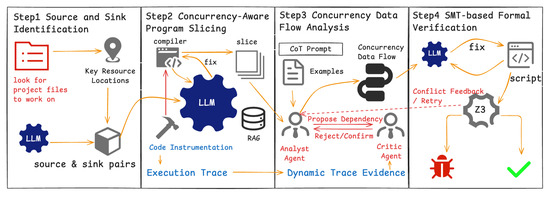 To mitigate the aforementioned shortcomings, recent research has focused on integrating static analysis and LLMs by leveraging structured semantic information such as program slicing, dependency paths, and symbolic execution trajectories to augment the contextual input provided to LLMs. The primary aim of this strategy is to improve the models’ perception of program behavior and reasoning accuracy. While methods utilizing program slicing or control flow pruning reduce contextual redundancy, and others convert data flow paths into natural language to guide interpretable reasoning, the field remains in an exploratory phase regarding robust multi-threaded semantic modeling and the explanation of causal chains for concurrency bugs.