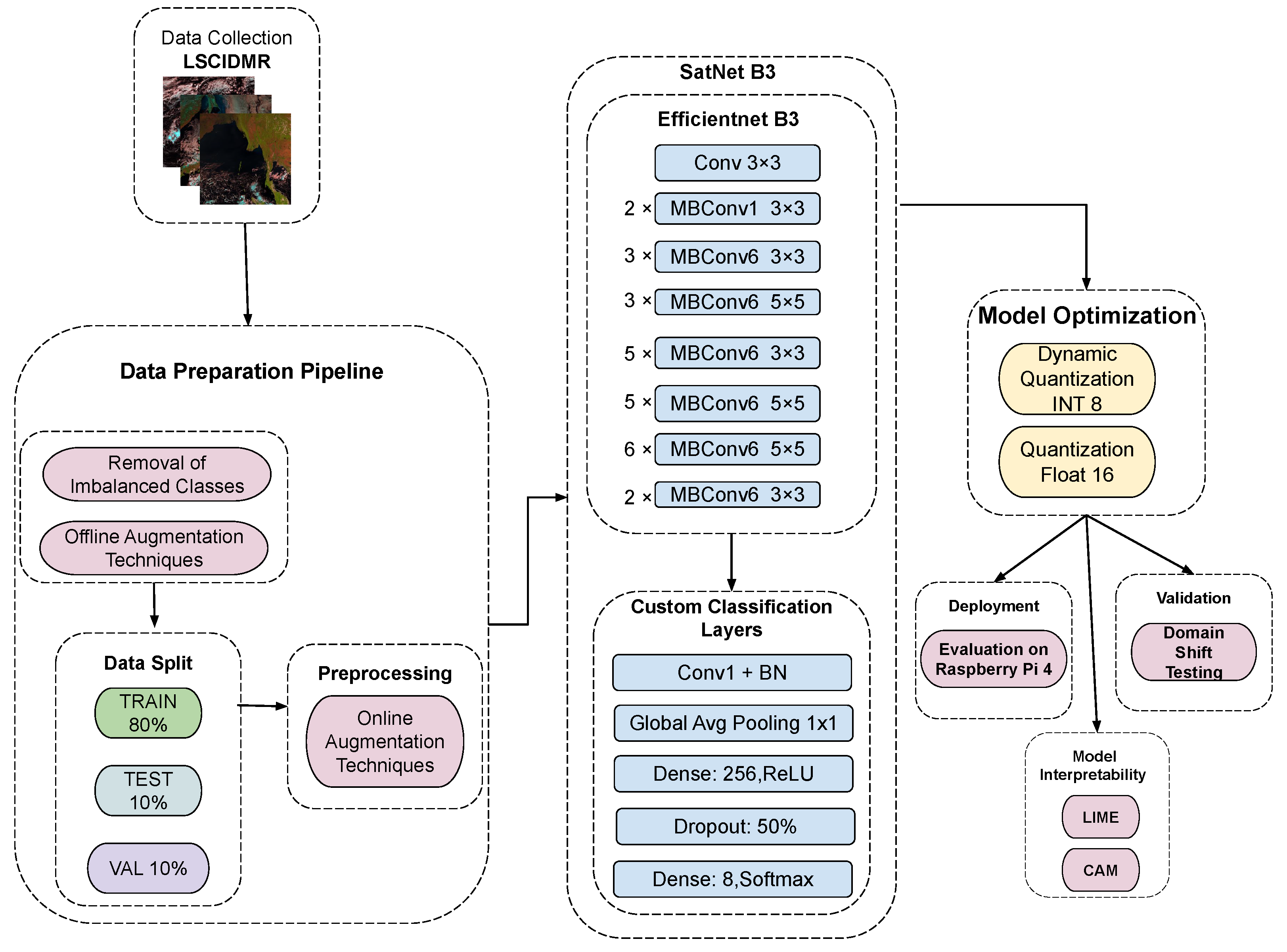 Figure 1 summarizes the complete methodology. The process begins with acquiring the satellite imagery from the LSCIDMR dataset, followed by multiple preprocessing steps, including class filtering, the removal of underrepresented categories, and offline and online augmentation. After preparing the dataset, we develop the proposed SatNet-B3 architecture, which is an optimized version of EfficientNet-B3 tailored for satellite weather classification. The model is trained using the augmented dataset and validated with standard evaluation procedures. Finally, we apply post-training quantization techniques to convert the model into a lightweight INT 8 version for deployment on edge devices such as the Raspberry Pi 4.