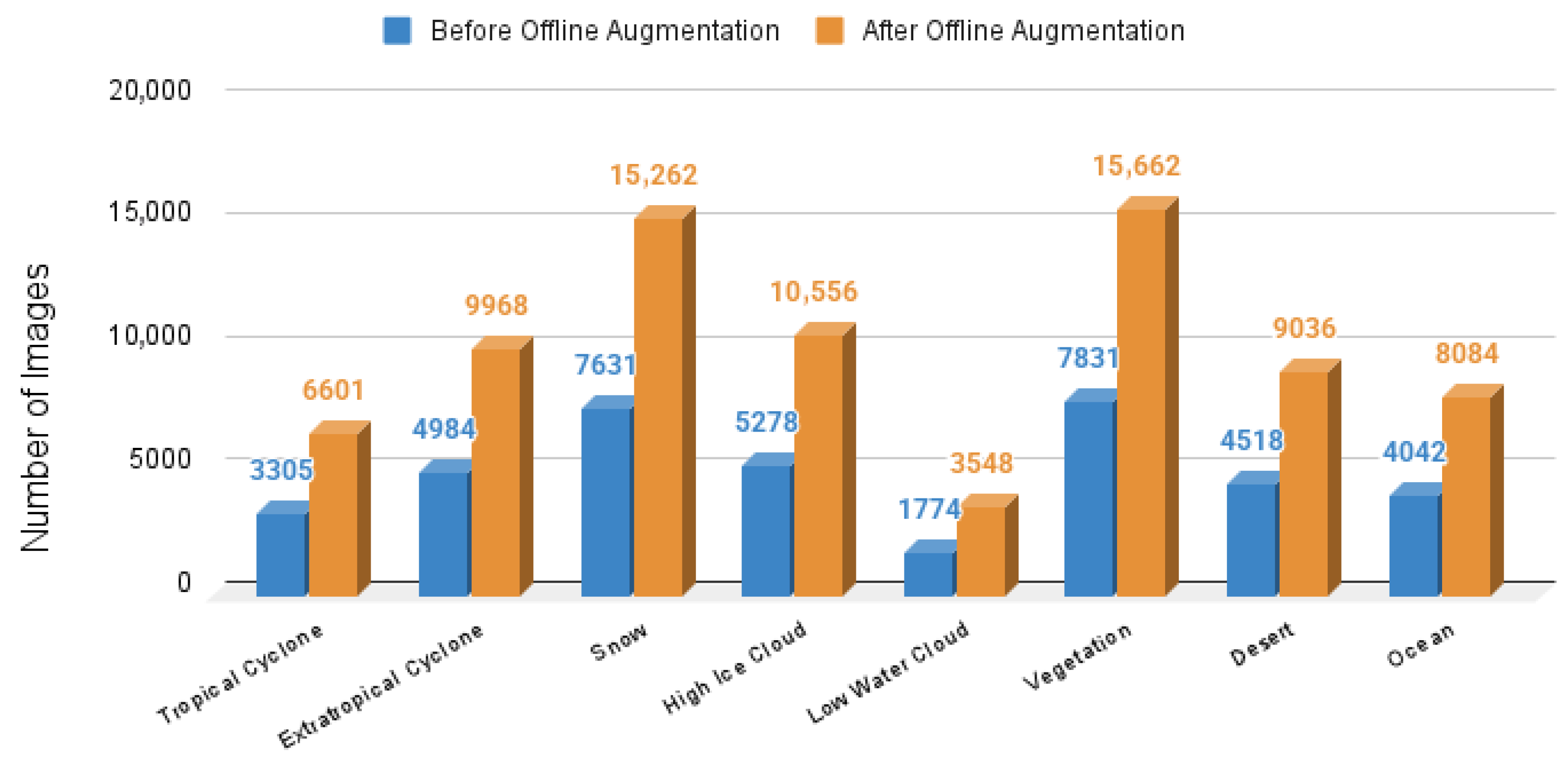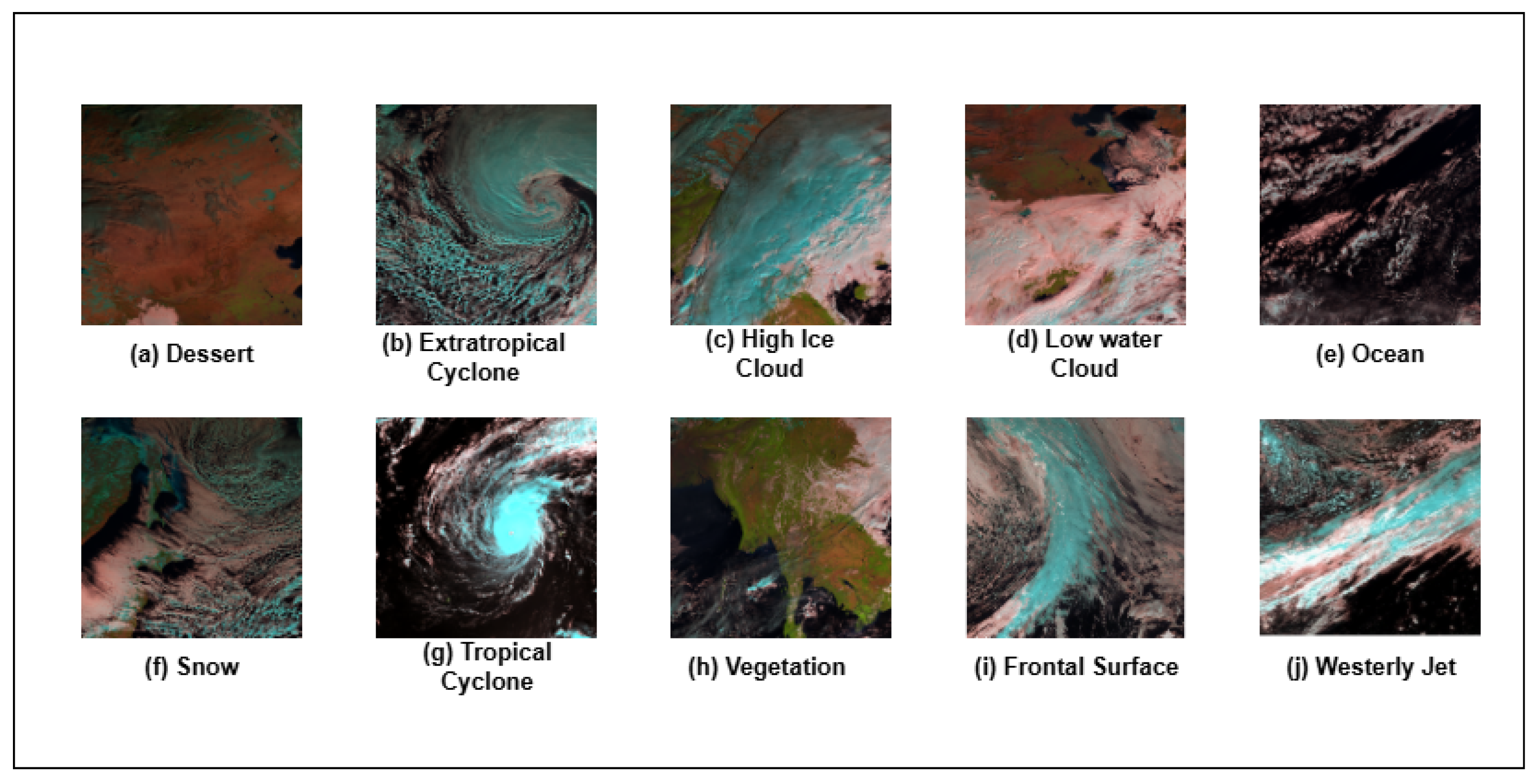 29]. The images are 256 × 256 pixels in size with a 10 min temporal resolution and 2 km spatial resolution. The dataset contains two types of annotations: single-label (LSCIDMR-S) and multi-label (LSCIDMR-M). The single-label images are classified based on the dominant scene type in the image, whereas the multi-label images are annotated with segmentations for each class in the image. For this study, LSCIDMR-S is chosen for image classification purposes.