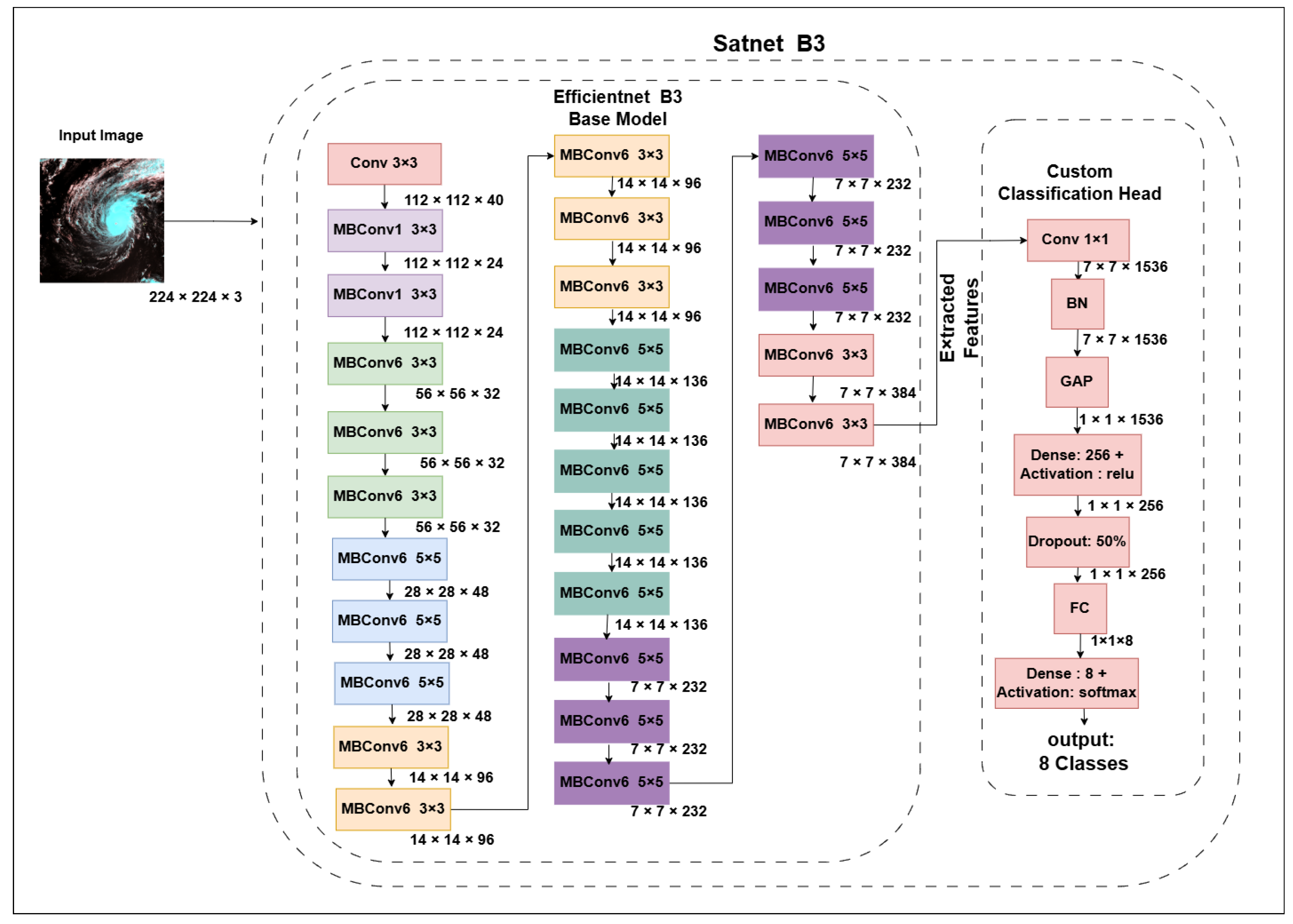 Figure 5 illustrates the complete architecture of the proposed SatNet-B3 model, including the EfficientNet-B3 backbone and the custom classification head. The model receives a 224 × 224 × 3 satellite image as input and passes it through the stacked MBConv blocks of EfficientNet-B3. The model retains EfficientNet-B3’s pre-trained convolutional blocks for hierarchical feature extraction but incorporates several modifications in the classification head specifically designed to improve performance on imbalanced meteorological data. The feature map sizes across the backbone follow the original EfficientNet-B3 scaling rules, while the custom classification layers added in SatNet-B3 reshape and refine the extracted features to improve decision boundaries for satellite imagery.