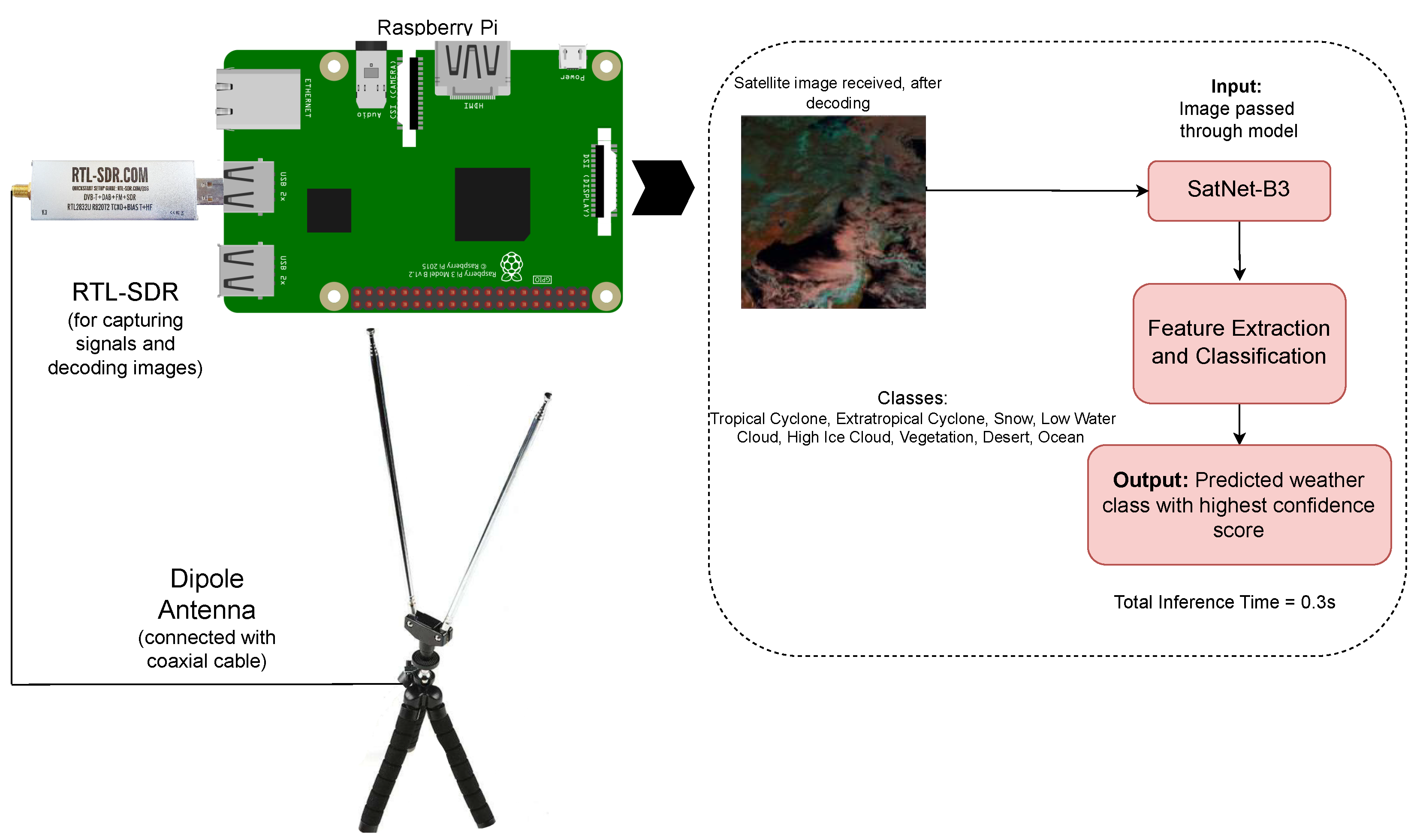 Addressing these limitations will be an important direction for future work. Future efforts could involve expanding the system’s deployment to integrate physical antenna systems for direct real-time data acquisition, testing the model on various edge devices beyond the Raspberry Pi 4 to assess environment-specific performance. Additionally, the deployment of the system on boats or ships for real-time data collection and weather analysis could greatly improve safety and preparedness for sea travelers. Further improvements may focus on additional compression techniques, broader evaluation across diverse imaging conditions, and integration with live-weather systems in disaster-prone regions. Evaluating SatNet-B3 on data from different satellites can also enhance its generalizability. Future research may also explore targeted data collection to reintegrate rare categories, such as the Frontal Surface and Westerly Jet categories, and expand the model’s applicability to a broader range of meteorological events. Overall, this research has the potential to improve weather analysis systems and enhance disaster preparedness in resource-limited settings.