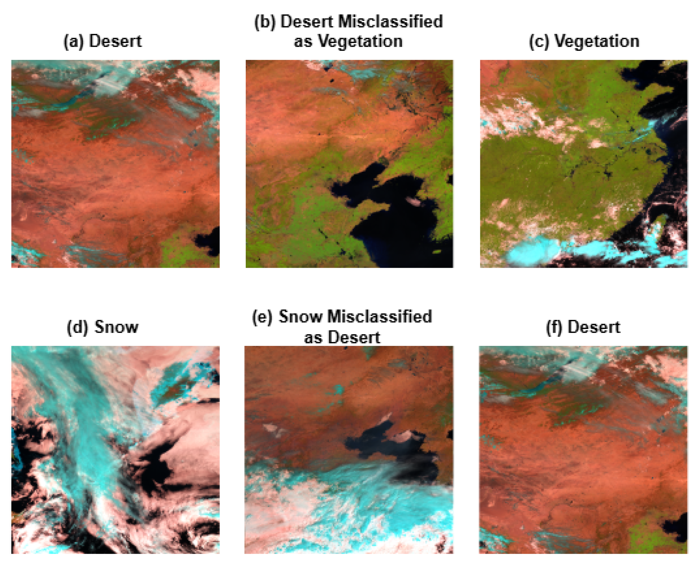Figure 10 presents representative misclassified samples. As shown, Desert–Vegetation and Snow–Desert confusions arise due to overlapping visual patterns between these meteorological scenes in a single image. These examples highlight that inter-class overlapping exists in a small subset of the dataset, which contributes to the misclassification errors observed.