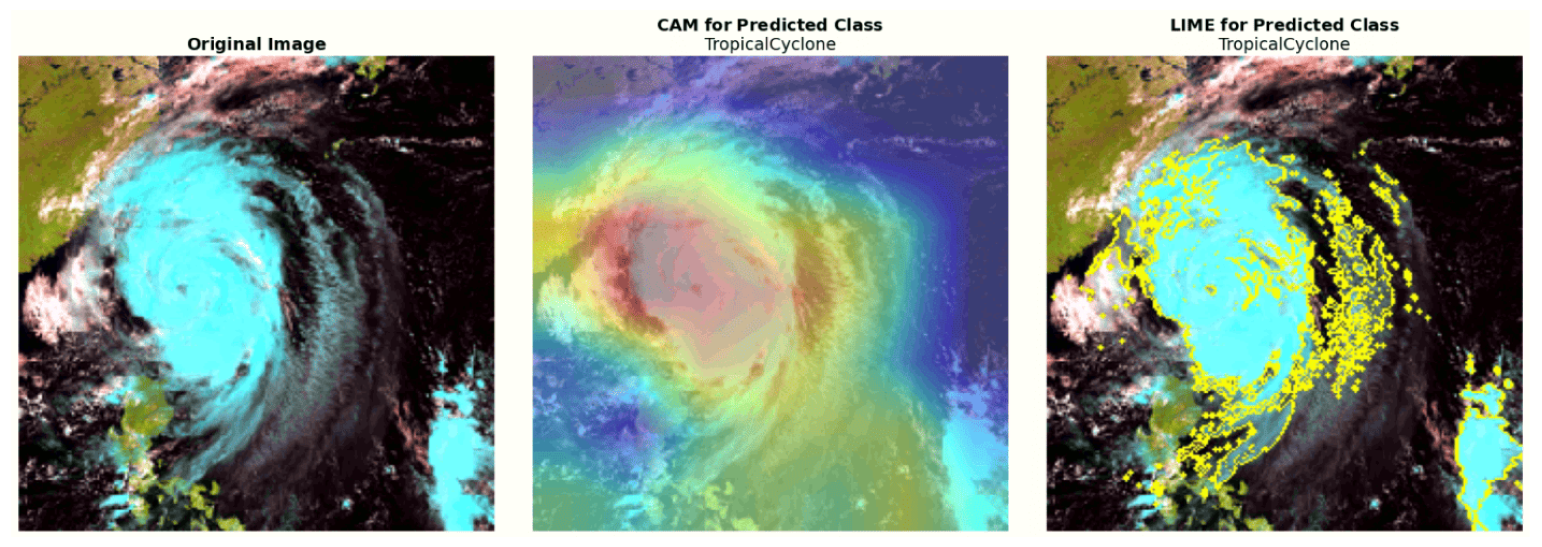 Beyond its technical performance, this study emphasizes the interpretability of the model, which is important for meteorological applications. Explainable AI methods like LIME and Class Activation Mapping (CAM) were applied to show which parts of the satellite images had the greatest impact on the model’s classification decisions. This capability enhances the model’s reliability, particularly for critical scenarios like disaster management and agricultural planning.