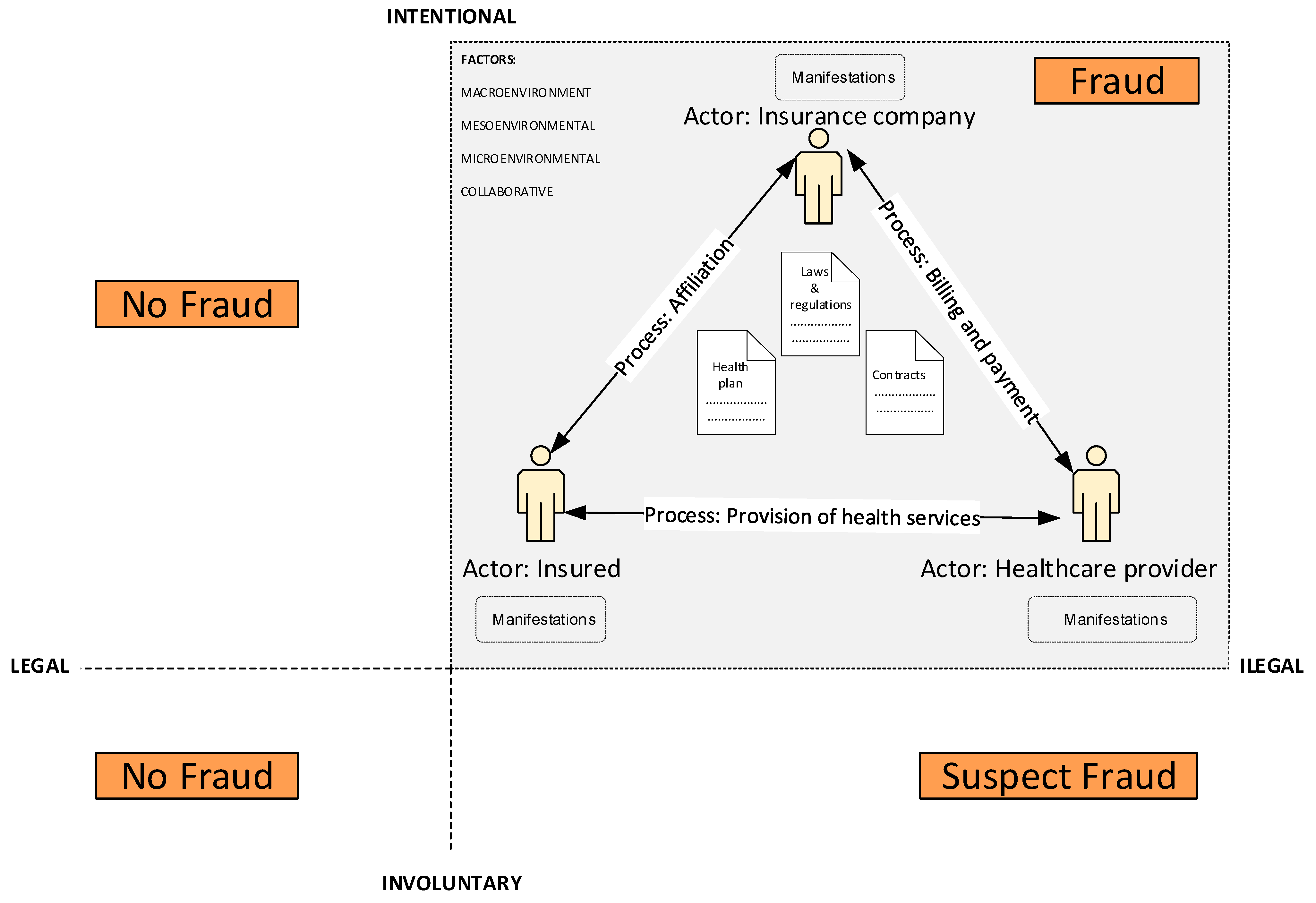 | Phase 1. Identifying signs of fraud | First, we consider the theoretical framework. According to the definition of SML [10], fraud cannot be asserted without verifying intent and the obtaining of illegal benefits. In other words, “HIF is an act based on intentional deception or misrepresentation to obtain illegal benefits related to the coverage provided by health insurance.” Since intent cannot be determined at this stage, it is possible to analyze noncompliance with the regulatory framework and local regulations, which could generate suspicion. This suspicion could correspond to potential fraud. Second, we consider the local socioeconomic dynamics specific to the health sector and their direct influence on SML. To do this, we must analyze the elements defined in fraud theory, using the Fraud Triangle [24], the Fraud Diamond [25], and MICE (Minimum Incentives, Comprehensive Care, and Enterprises) [26], COSO (ERM), among others †. |