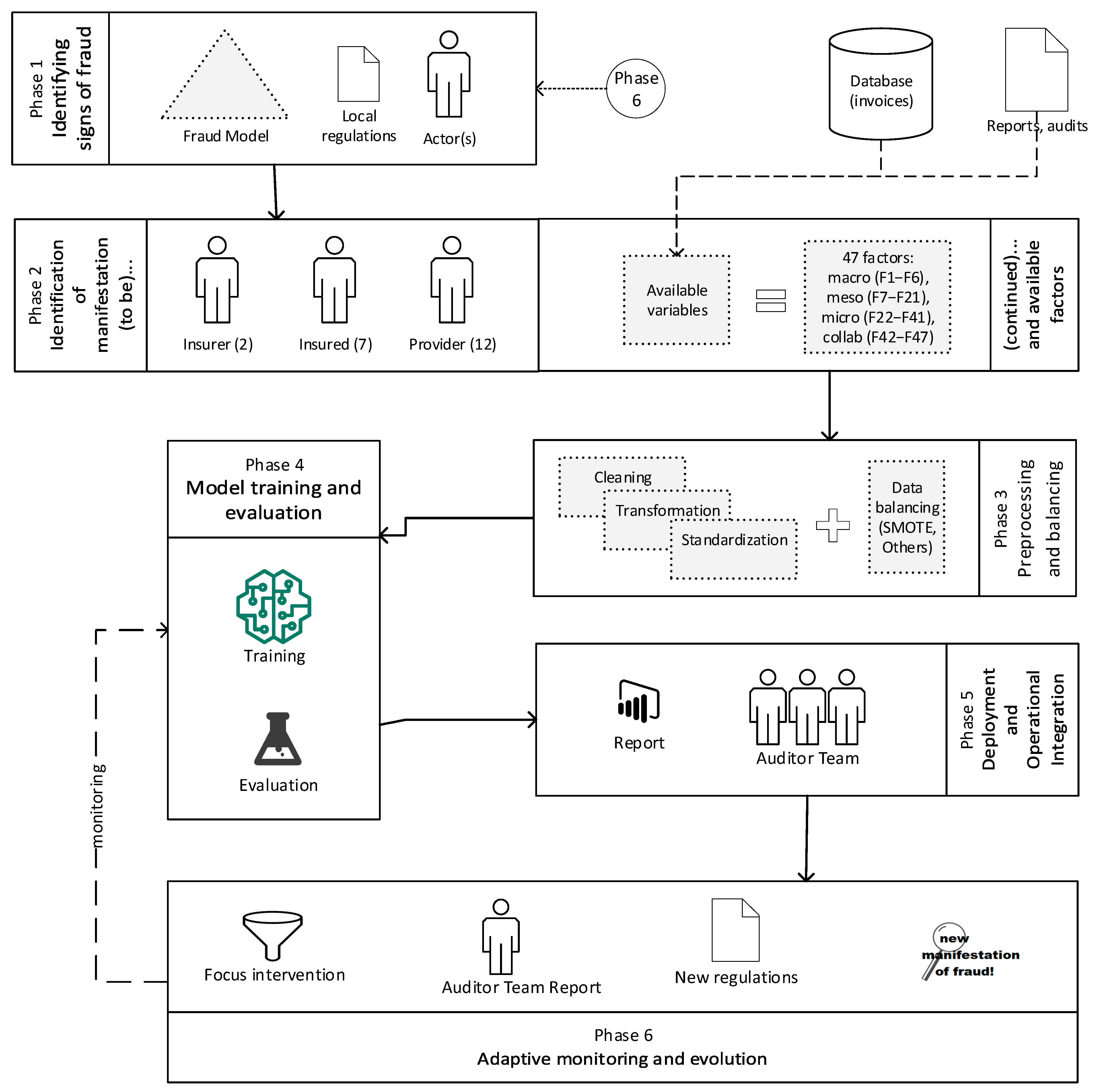 | Phase 6. Adaptive Monitoring and Evolution | A continuous monitoring system for the SML detection model’s performance is implemented, with automated alerts on key metrics (F1 score, recall, false positive rate) to ensure the model remains current in identifying new fraud patterns. To this end, periodic model retraining cycles are performed, incorporating new factors or manifestations based on regulatory changes, as well as false positive/negative reports from the research team. The integration of these components guarantees that the system evolves in tandem with fraudulent tactics and regulatory frameworks, preserving its accuracy in dynamic healthcare environments. |