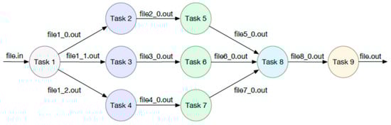 Illustrative workflow with nine activities. The graph nodes signify computing jobs, while the edges denote the data dependencies among these activities [].