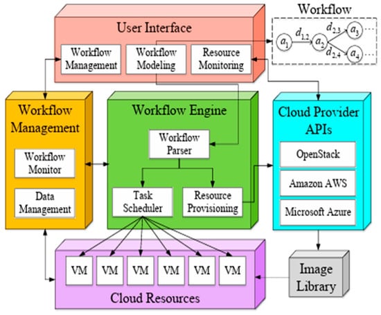 A standard cloud-based scientific workflow system consists of five fundamental modules: the workflow engine, user interface, workflow management module, cloud provider APIs, and cloud resources, as seen in Figure 3. The workflow engine obtains the designated workflow from users by modeling their operations in the user interface. The three main features of the cloud-based scientific workflow system are resource allocation, workflow scheduling, and workflow interpretation. The workflow engine serves as the system’s primary component. The resource provisioning module will generate virtual machines (VMs) according to the resource specifications established by the workflow parser after the submission of the workflow [,,].