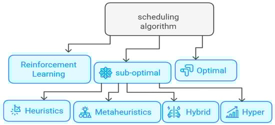 Hybrid combines two heuristic algorithms, PSO and GA, or hyper with reinforcement learning or another way [,,]. Hyper-heuristic is an automated methodology for selecting or generating heuristics to solve hard computational search problems []. Table 1 shows the differences, benefits, and limitations of each approach used in scheduling.