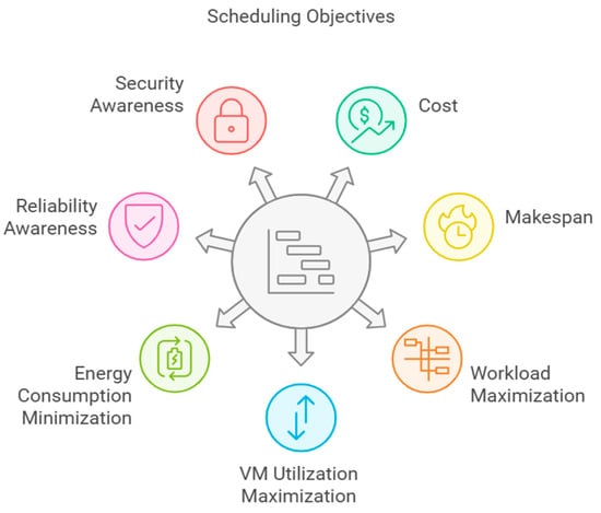 All surveyed algorithms share the fundamental characteristic of cost awareness. Along with this goal, most algorithms look at performance indicators, such as the total time the system takes to run and the number of operations it does. Moreover, several cutting-edge algorithms integrate energy consumption, dependability, and security into their aims, as shown in Figure 5 [,,,]. Choosing less expensive resources, such as less energy-efficient servers or data centers, is a common strategy for cost reduction. Compared to more expensive, energy-efficient options, these resources may use more energy per job or computing unit.