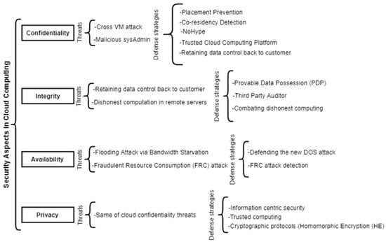 The Confidentiality, Integrity, and Availability (CIA) triad remains the most widely used framework for defining security vulnerabilities in traditional information systems. The primary goal of this section is to extend these security principles to the emerging cloud infrastructure. Figure 7 illustrates the key components of cloud computing data security, highlighting potential threats and corresponding countermeasures [,]. By adapting the CIA model to cloud environments, we can better understand and address the unique challenges posed by distributed systems, multi-tenancy, and remote access inherent in cloud computing.