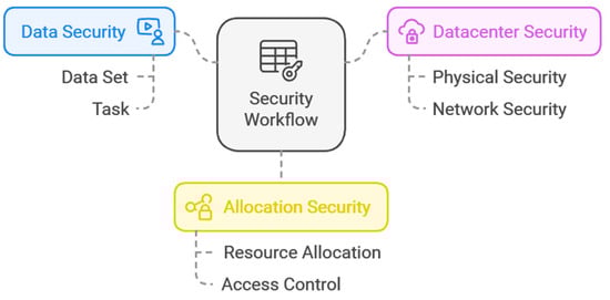Moreover, cloud system security provides numerous advantages, such as centralized protection, decreased expenses and management, and enhanced reliability. In IaaS cloud workflow execution, a workflow management system (WMS) assigns workflow tasks to secure cloud resources to ensure failure-free execution. A secure workflow system necessitates consideration of several security services for modeling security-sensitive applications, including authentication, integrity, and confidentiality, as elaborated in Section 4.7 [,]. Investigations have been conducted about security concerns related to scheduling. Data security, data center security, and infrastructure security are the three categories into which the authors divided models after identifying the many security restrictions [,]. Our paper divided the security scientific workflow into data security, data center security, and allocation security, as shown in Figure 8, which shows each level.