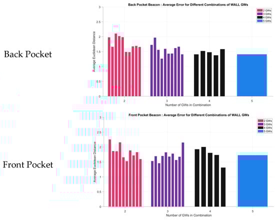 The results indicate a clear impact of the number of gateways on the localization error. As the number of gateways increased, a reduction in localization error was observed across all body positions. Specifically, with two gateways, the error ranged from 1.36 m to 1.62 m, while with five gateways, the error ranged from 1.21 m to 1.72 m. This suggests that a higher number of gateways improves indoor localization accuracy. However, the effect of gateway count on error varies by body position. Figure 11 illustrates the average localization errors associated with different combinations of wall-mounted gateways.