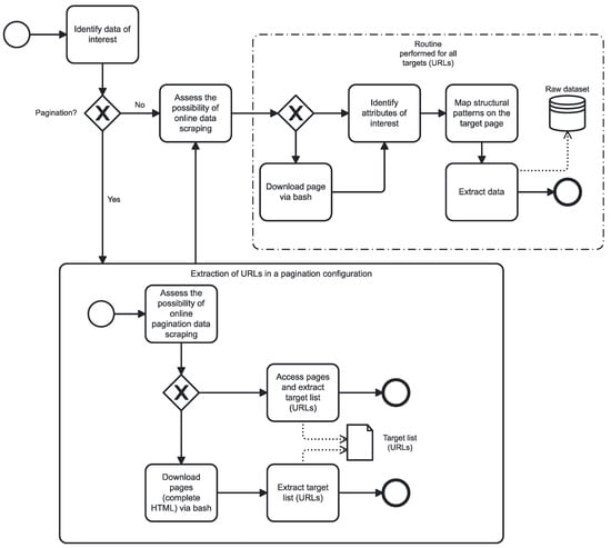 Figure 2 presents the general framework for data collection using web scraping routines. We used BPMN notation in constructing the diagrams to facilitate understanding of the procedures performed []. Data collection on digital platforms often involves navigating pagination structures, a necessary step to access the addresses of posts organized within higher hierarchical pages. These posts, which may include journalistic texts, blog entries, or social media content, are typically organized in a structured manner and are frequently presented in paginated formats that are interactively navigable. Pagination may be implemented through navigation buttons, page counters, or infinite scrolling, each of which dictates the specific strategies required for effective data collection.