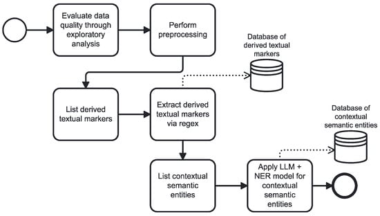 Following the identification and extraction of attributes from structured textual markers, it is essential to define, in accordance with the research problem and the context of the digital platform, attributes related to contextual semantic entities. These refer to unstructured markers such as names of individuals, brands, political parties, and geographic locations. For this purpose, an NER-LLM solution is employed. It is important to ensure that the use of pre-trained models adheres to best practices for validation and contextualization, which involve the use of testing and validation metrics. Based on the application of the NER-LLM solution, a new derived file is generated for each contextual semantic entity of interest, following a structure similar to that of datasets containing structured textual markers. These derived files maintain a one-to-many cardinality relationship with the primary dataset.