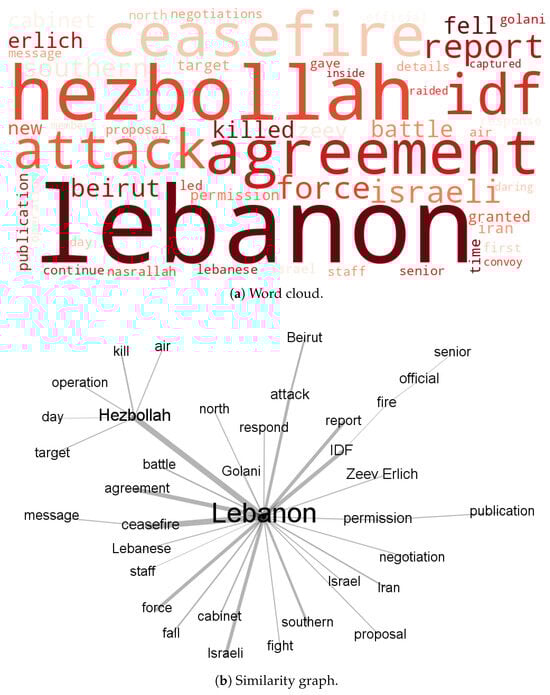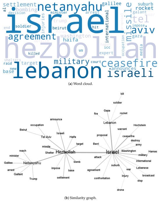 The word cloud presented in Figure 7a corresponds to the textual corpus extracted from Google News Lebanon, which contains mentions of Israel. The most prominent terms, such as “Israel”, “Hezbollah”, “Lebanon”, and “military”, reflect their high frequency in the analyzed headlines, indicating the centrality of topics related to the geopolitical conflict between the two countries. The prevalence of words like “missile”, “rocket”, and “ceasefire” underscores the emphasis on military events, such as attacks and efforts to establish a ceasefire. These aspects are further supported by terms like “agreement”, “international”, and “court”, which suggest mentions of diplomatic efforts, international mediation, or legal repercussions associated with the reported events. Additionally, terms like “Netanyahu” (referring to the Prime Minister of Israel), “Tel Aviv”, “Galilee”, and “Gaza” point to geographic locations and political figures playing significant roles in this context.