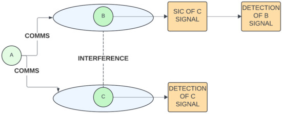 With SIC, the bits of the strongest signal are prioritized for decoding initially. Subsequently, the original signal corresponding to those bits is reconstructed and subtracted from the combined signal. This iterative method facilitates the recovery of multiple packets, hence earning the moniker successive interference cancellation [39]. The aim here is to decode the signal of interest and cancel out the interference caused by the interfering nodes in order to obtain the SINR of the current node, as can be seen in Figure 1. The A, B, and C circles correspond to nodes, which operate within a transmission range and the boxes the operations that take place during the operation.