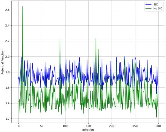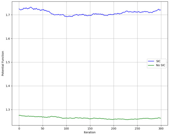 The potential function depicted in Figure 2 shows the potential function with SIC and non-SIC. It is clear that the potential function is higher when using the SIC-based potential game with the value being as opposed to non-SIC, which is .