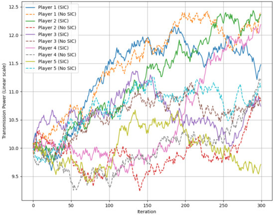 Thereafter, the transmission power evolution of the players with SIC and non-SIC is illustrated in Figure 3. Nash equilibrium transmission powers that correspond to near-optimal receiver powers are those where no player finds it beneficial to unilaterally deviate from their chosen power level, considering the strategies of the other players. There are cases in which the transmission power level of certain nodes exhibit a higher value with SIC as opposed to non-SIC. Moreover, the opposite is also shown. More specifically, the transmission power levels of each player/node are given in Table 1. The difference is mainly caused by the interference whereby the players increase their transmission power levels to accomplish a higher SINR.