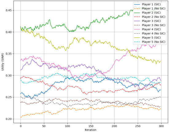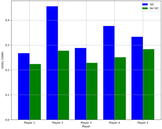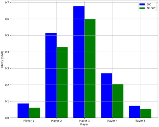 In Figure 4, the reader can observe the final utilities based on the SINR over the iterations. It is evident that the SIC method achieves a higher utility. Should these results be cross-examined with the transmission powers, it is clear that players increase their transmission powers to accomplish higher utilities (e.g., player 2), while in other cases, the players select a smaller transmission power level since it is not in their incentive to increase it because it will cause more interference (e.g., player 5).