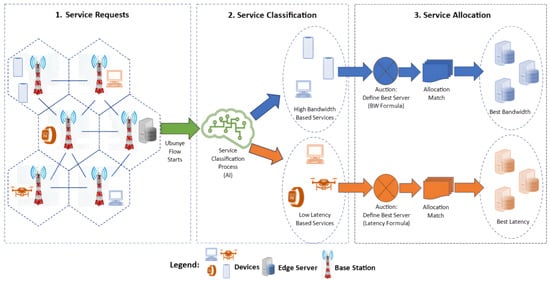 Figure 1 illustrates the workflow of our proposal. Initially, devices request services via base stations in the mobile network, which forward these requests to nearby edge nodes for classification. Services are classified and grouped based on their requirements by an ML model, with blue representing high bandwidth requirements and orange denoting low latency. The allocation phase involves an auction process, where edge nodes bid according to these requirements. The service is ultimately granted to the node that offers the highest bid.