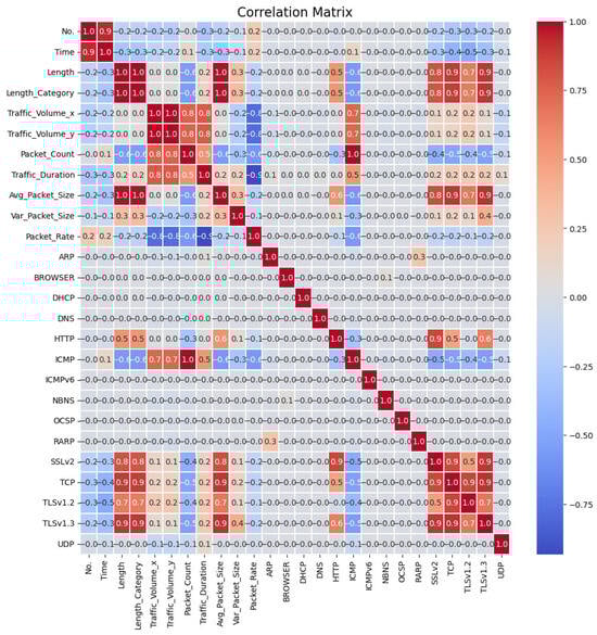 Calculating the correlation matrix involves analyzing the relationships between numerical attributes in the network traffic dataset. First, we manually selected only the columns in the dataset that contain numerical values, excluding those with text-based information. After that, we computed the correlation matrix to evaluate the strength and direction of the linear relationships between the variables. The correlation matrix is based on the Pearson correlation coefficient. The coefficient ranges from −1 to 1, where values close to 1 indicate a strong positive correlation, values close to −1 indicate a strong negative correlation, and values close to 0 indicate no linear correlation.