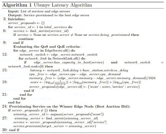 The algorithms in Figure 4 and Figure 5 present our resource allocation proposal, which covers three stages: initialization, evaluation, and provisioning. In the initialization stage, the dataset (.JSON file) is loaded with the simulation scenario settings, creating the number of users, base stations, routers, links, applications, services, and predefined edge nodes in each scenario. In the evaluation stage, the available edge nodes are scored according to the predefined QoS and QoE criteria, and a score for each one is calculated using Equations (1) and (2). At the end of this stage, the edge node with the highest score is defined. In the provisioning stage, the initialized service will be assigned. The process will be repeated until all the requested services have been provisioned and meet the simulation’s stop criteria.