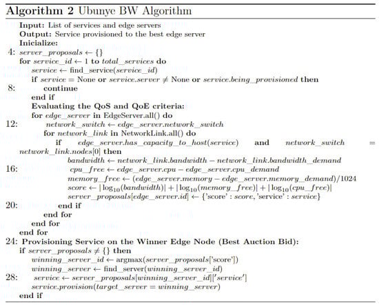 The Ubunye auction algorithm’s initialization process determines the initial prices of the resources. Each resource j has an initial price . Initially, all prices can be equal to zero or some arbitrary value [29]. The algorithm then proceeds with iterations, in which the agents update their bids based on the current prices of the resources and the initial values. We propose two bid formulas, one based on latency and another based on bandwidth (BW), according to the QoE requirements of user applications, CPU load, and memory usage.