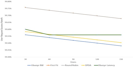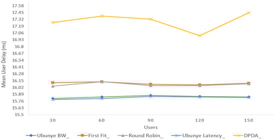 - Mean user delay: In Figure 15, we compared the variation in mean user delay between Ubunye and the other algorithms as we varied the number of users. With the failure scenario, we saw that the DPDA algorithm had the best performance, with Ubunye BW falling to second place, followed by first-fit, Ubunye latency, and round robin. However, as we increased the number of users, we noticed a degradation in the DPDA performance and an improvement in the performance of the Ubunye BW and latency algorithms, which regained first and second place, respectively, in the scenario with 150 users.