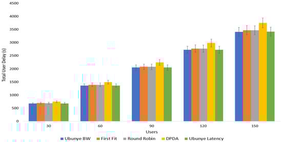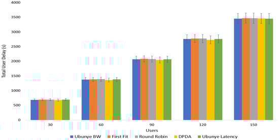 Figure 10. Total user delay (in seconds): the total sum of user delay over the total simulation time, varying the number of users in each scenario. - Mean bandwidth: Figure 11 shows the mean bandwidth available, measured in the first ten minutes of the simulation for the 150-user scenario. Our algorithm outperformed others, showing a 22% improvement over the first-fit and round robin algorithms and 47% over the DPDA algorithm. The Student’s t-test confirmed the samples as statistically significant in all scenarios. Additionally, the Ubunye latency algorithm surpassed the Ubunye BW algorithm by 11.4% during the observed interval.