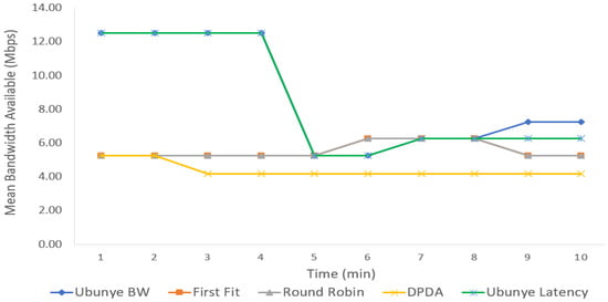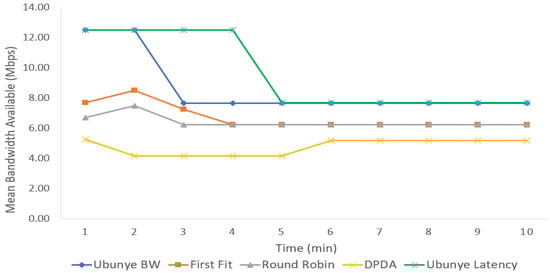 Figure 11. Mean bandwidth available (in megabits per second): measured in the first ten minutes of the simulation for the 150-user scenario. - CPU resources: We analyze the percentage of total CPU consumption for five algorithms while varying the number of users in each scenario. The results in Figure 12 show that Ubunye had lower CPU consumption due to its efficient load-balancing feature.