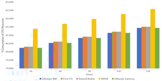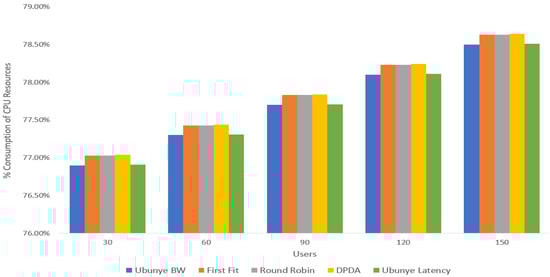 Figure 12. Consumption of CPU resources: percentage of the total CPU consumption for five algorithms, varying the number of users in each scenario. - Memory resources: When measuring the memory usage of edge servers (Figure 13), Ubunye consistently achieved the lowest percentage of memory consumption. This positive outcome significantly enhanced the overall performance of the proposed topology in the simulation across all scenarios.