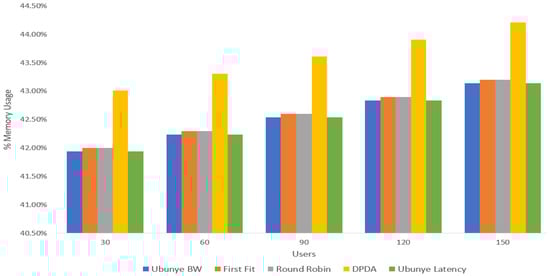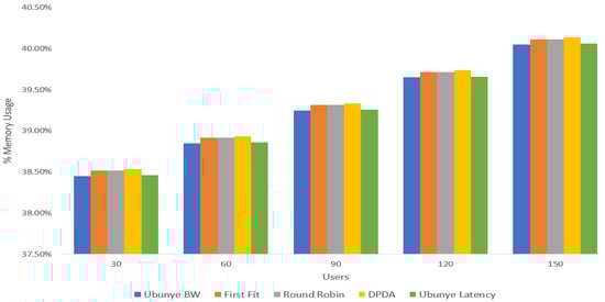 Figure 13. Memory usage: the percentage of memory used by the five algorithms varies by the number of users in each scenario. - User request success rate: The Ubunye maintained a success rate for user requests that was similar to that of other algorithms. This resulted from incorporating bandwidth as a QoE criterion when allocating edge resources in the proposed topology, as illustrated in Figure 14. The Ubunye latency algorithm improved this indicator compared to the Ubunye BW algorithm, securing the second position in the comparison of the five analyzed algorithms.