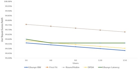 As seen in Figure 21, the Ubunye BW and latency algorithms achieved the best results in five out of six evaluation metrics. The classic algorithms, first-fit and round robin, also performed well, securing second and third places in five of the six metrics, with the best results in terms of user request success. However, the DPDA algorithm performed poorly in the simulated scenarios, although it showed a positive outcome in the user requests metric.