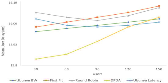 Figure 9. Mean user delay (in milliseconds): the ratio between the sum of the delays of all user requests and the total number of requests, varying the number of users in each scenario. - Total user delay: We compared the variation in total user delay, representing the total sum of user delay over the total simulation time, between our proposal and the other algorithms as we vary the number of users. Figure 10 shows our algorithm with the lowest total user delay for the same reasons given in the previous paragraph for all the algorithms. Our proposal obtained a gain of up to 2.1% compared to the classic algorithms (first-fit and round robin) and 9.9% compared to the DPDA algorithm. The Student’s t-test confirmed the samples as statistically significant in all scenarios.