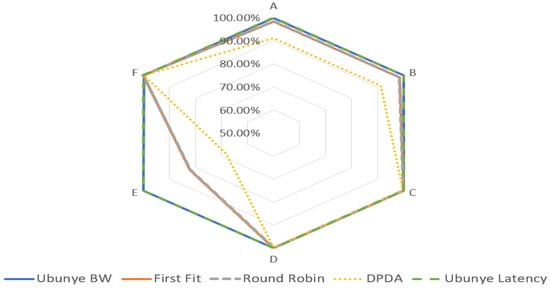 Figure 21 reflects the difference in overall performance between the algorithms. We calculated the average of each performance metric and used the best metric as a benchmark. In the graph, A represents mean user delay, B represents total user delay, C represents % CPU, D represents % memory, E represents mean bandwidth, and F represents user success rate.